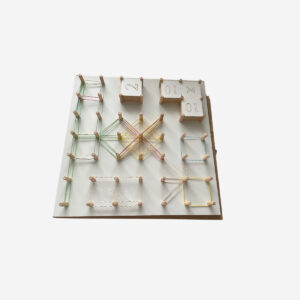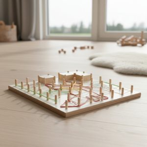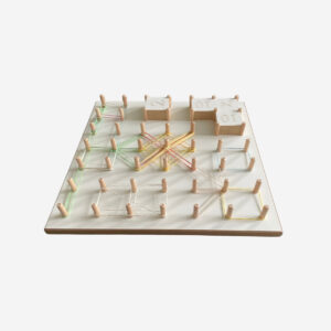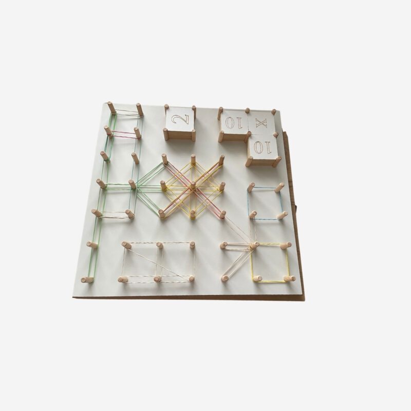 Geoplan to tablica manipulacyjna wykonana z solidnej płyty MDF, wyposażona w drewniane kołeczki rozmieszczone w regularnej siatce. Za pomocą kolorowych gumek można tworzyć różnorodne wzory, figury geometryczne, litery czy liczby.