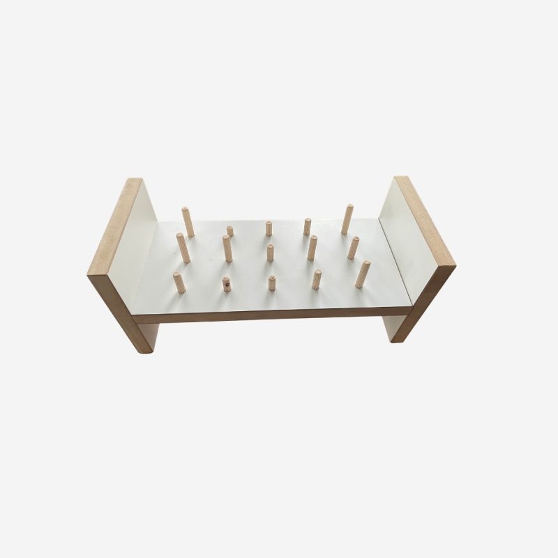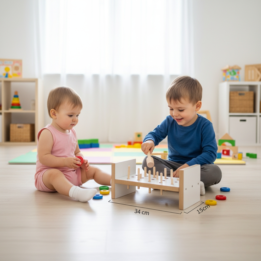 Podstawa wykonana została z trwałej płyty MDF, a kołeczki z litego drewna. Całość jest starannie wykończona i bezpieczna dla małych rączek. Zabawka zachęca do wbijania patyczków młotkiem lub dłonią, rozwijając precyzję ruchów i cierpliwość w działaniu.